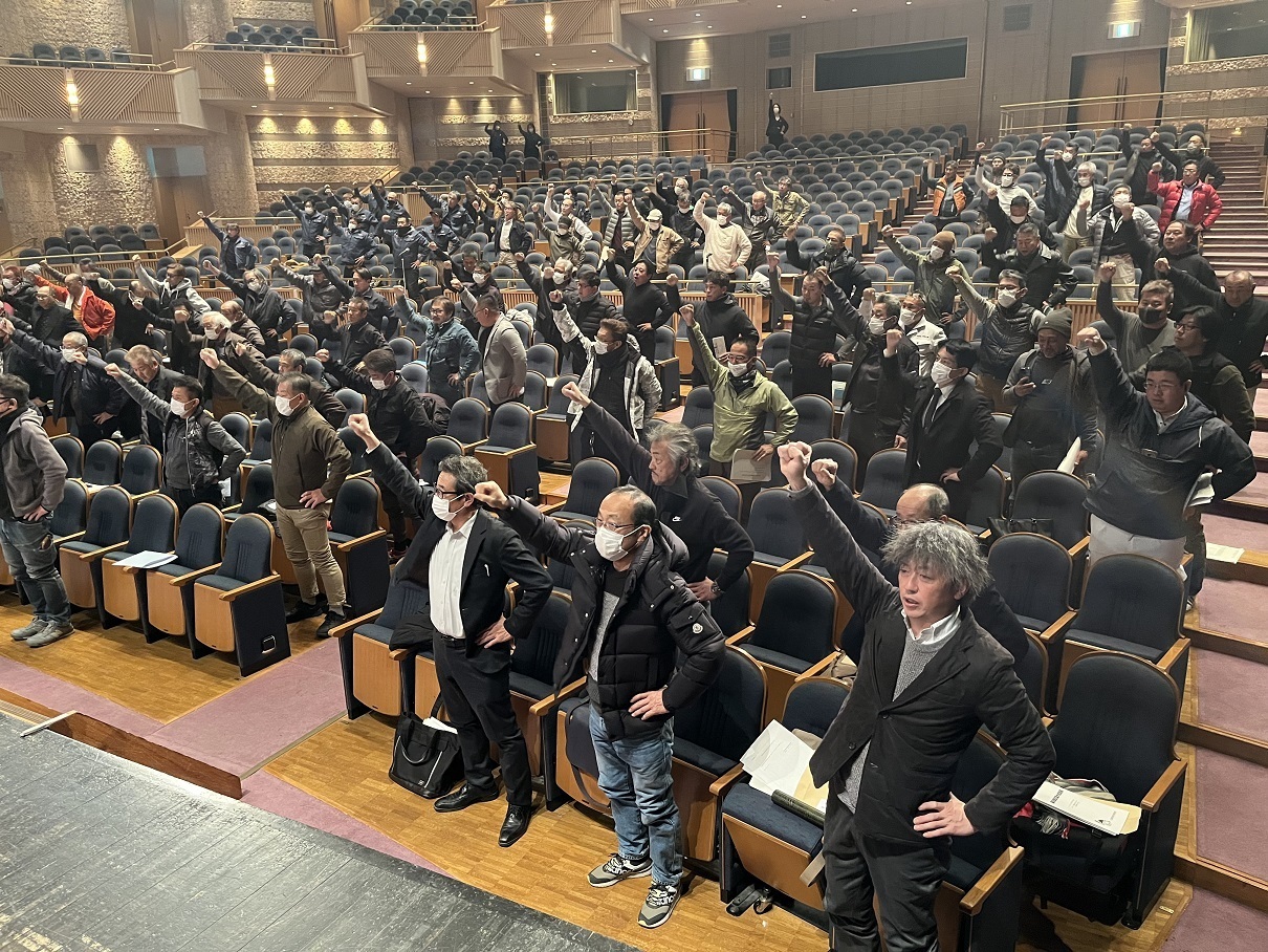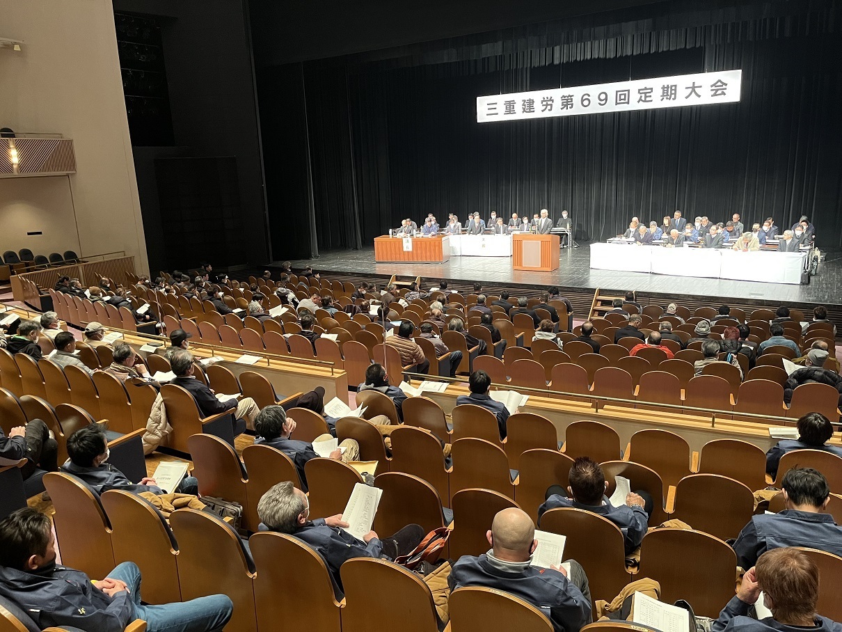 2月19日、第69回定期大会を三重県総合文化センター・中ホールで開催しました。大会には各支部の代議員や役員ら160人余が参加し、厳しい情勢の中、組合の成すべき諸課題について討議が行われました。役員改選では奥川委員長を再選。奥川委員長の発声でガンバロウを三唱し、諸要求実現に向け、仲間のさらなる団結強化を誓いました。