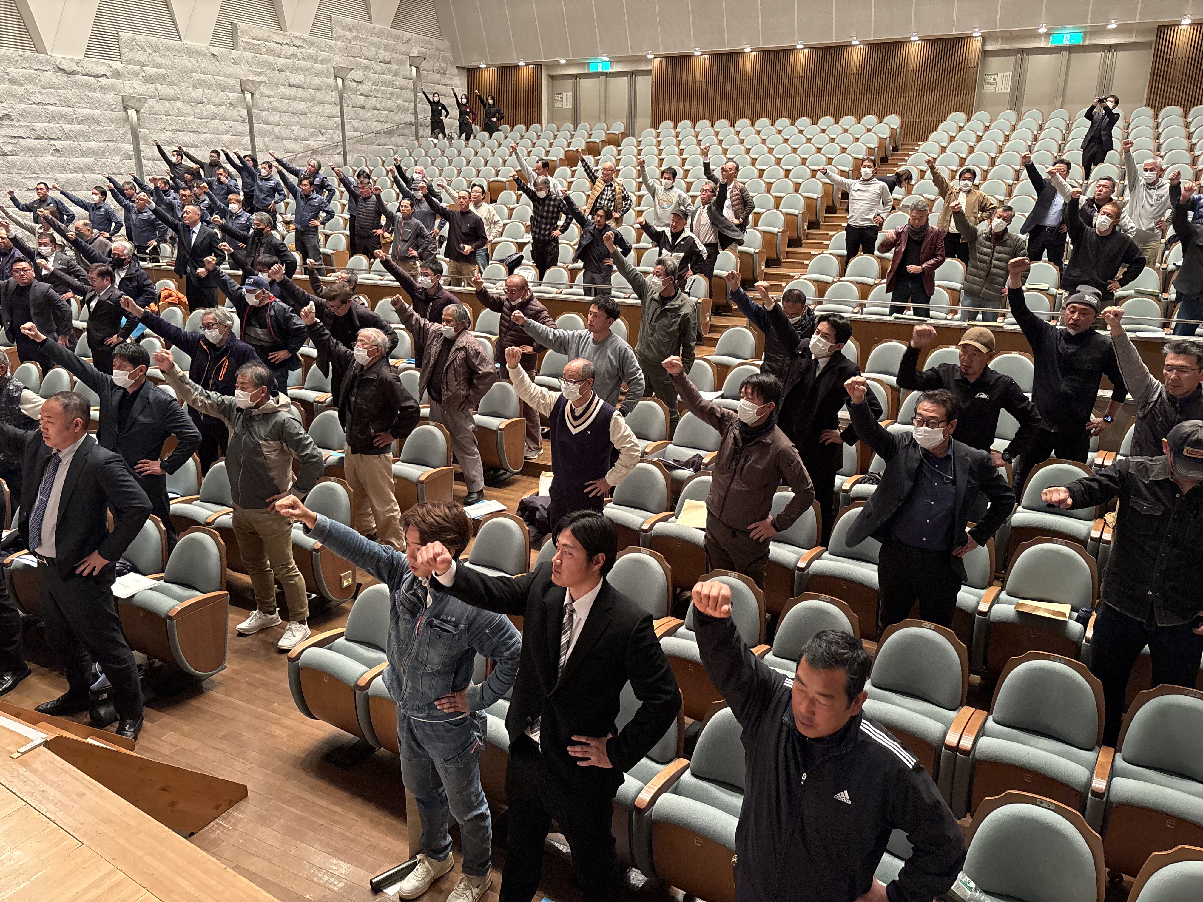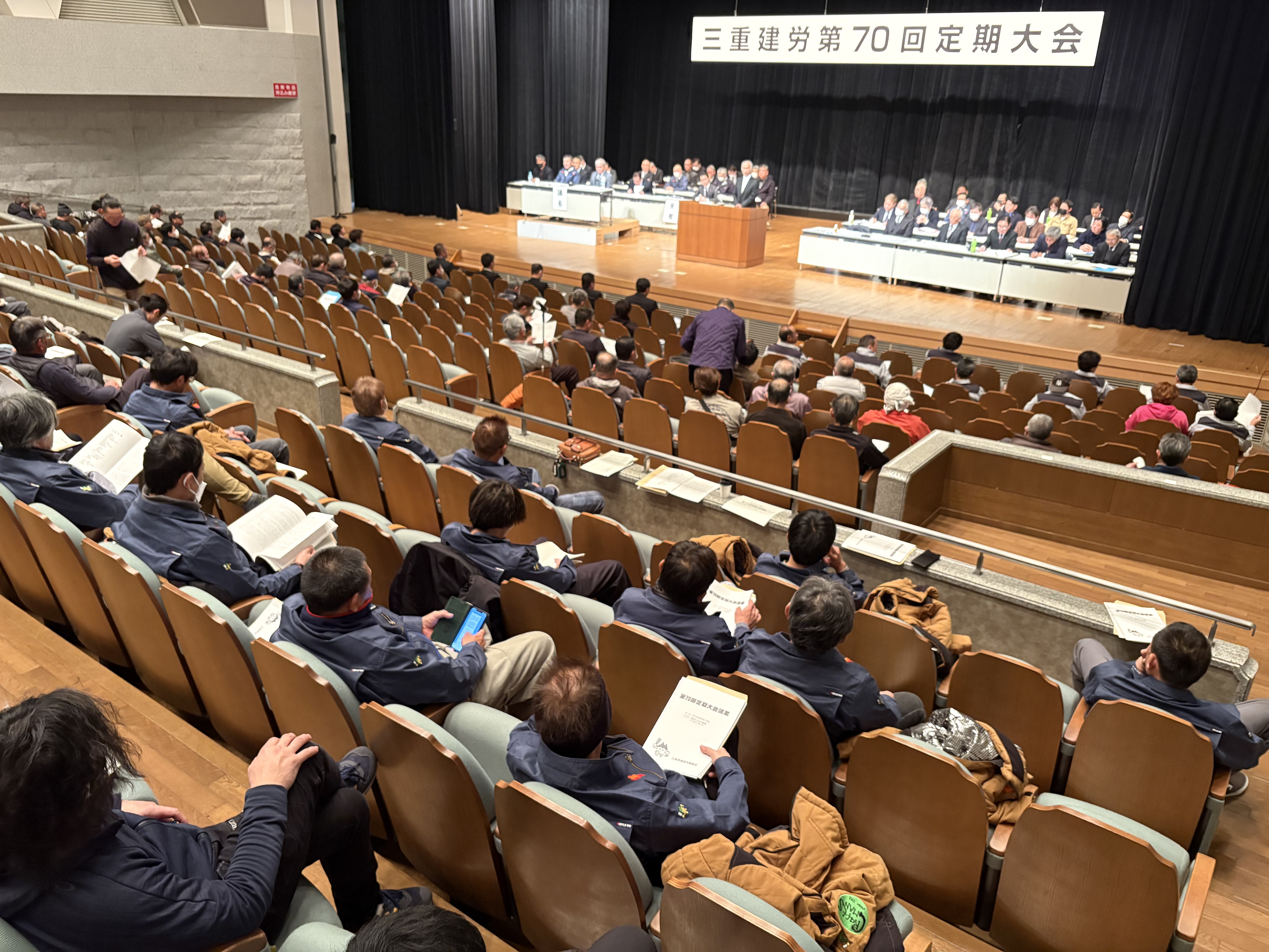 2月19日、第70回定期大会を津市サンヒルズ安濃・ハーモニーホールで開催しました。大会には各支部の代議員や役員ら160人余りが参加し、厳しい情勢の中、組合の成すべき諸課題について討議が行われました。役員改選では奥川委員長を再選。奥川委員長の発声で団結ガンバロウを三唱し、諸要求実現に向け、仲間のさらなる団結強化を誓いました。