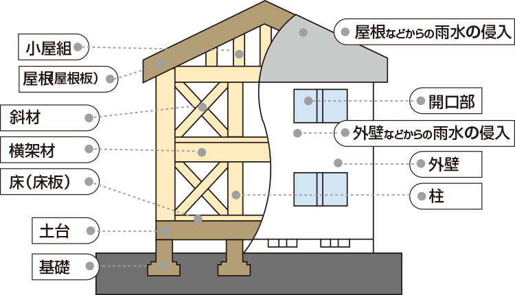 住宅瑕疵担保履行法に基づき定められた、構造耐力上主要な部分および雨水の侵入を防止する部分に関する10年間の瑕疵担保責任の範囲が保険の対象となります。